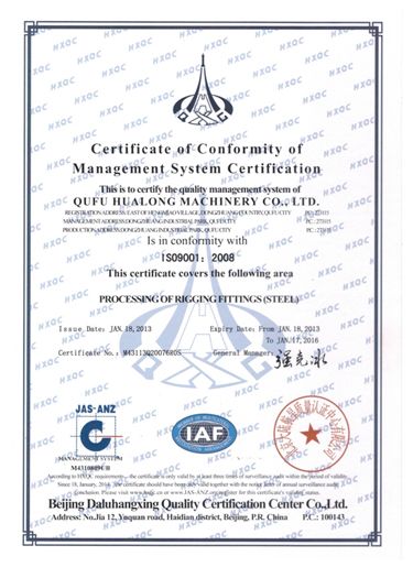 Qufu Hualong Machinery Co., Ltd. was established in 2001 March, is an independent business limited liability company. The company is located in historical and cultural city in China- Qu Fu city. Business scope: production and sales of various types of steel wire rope is connected with the rigging accessories, main products have steel swaging sleeves, swage duplex sleeves, stainless steel sleeve, a variety of precision parts of different kinds of hundreds of specifications. Product quality and stability, especially the technical indexes of the steel sleeve is not less than or more than Crosby S505, S506, S409, S510 sleeve, and as the  manufacturer in china at present,we could independent R & D and production according to customer requirements. In 2011 the company has independent import and export right, the products are exported to Europe, North America, South America and other countries and regions, are widely used in bridge, wharf, ship, roads and other infrastructure construction.